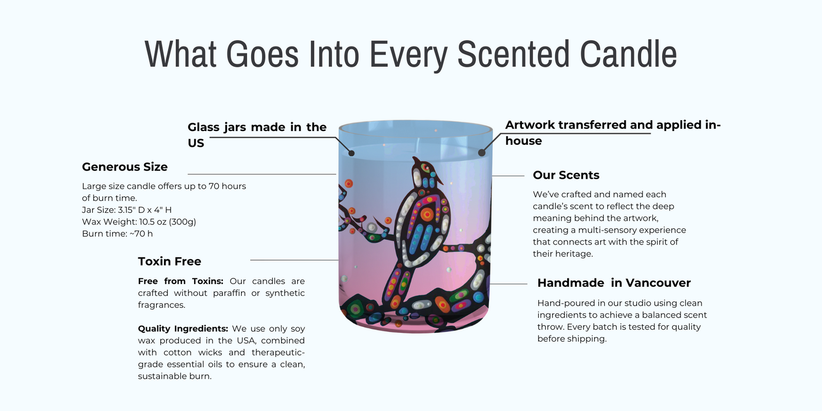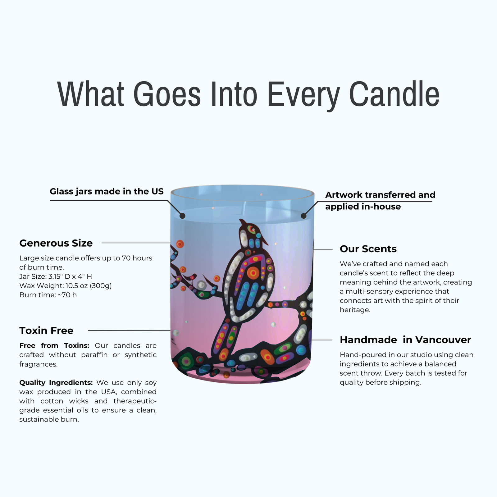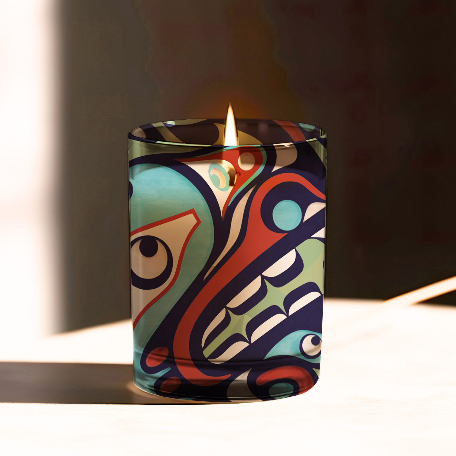 John’s art, inspired by the contemporary woodland style of Norval Morrisseau, features bold black contours and vivid colors that celebrate the spiritual bond between the Dene people and the natural world.
