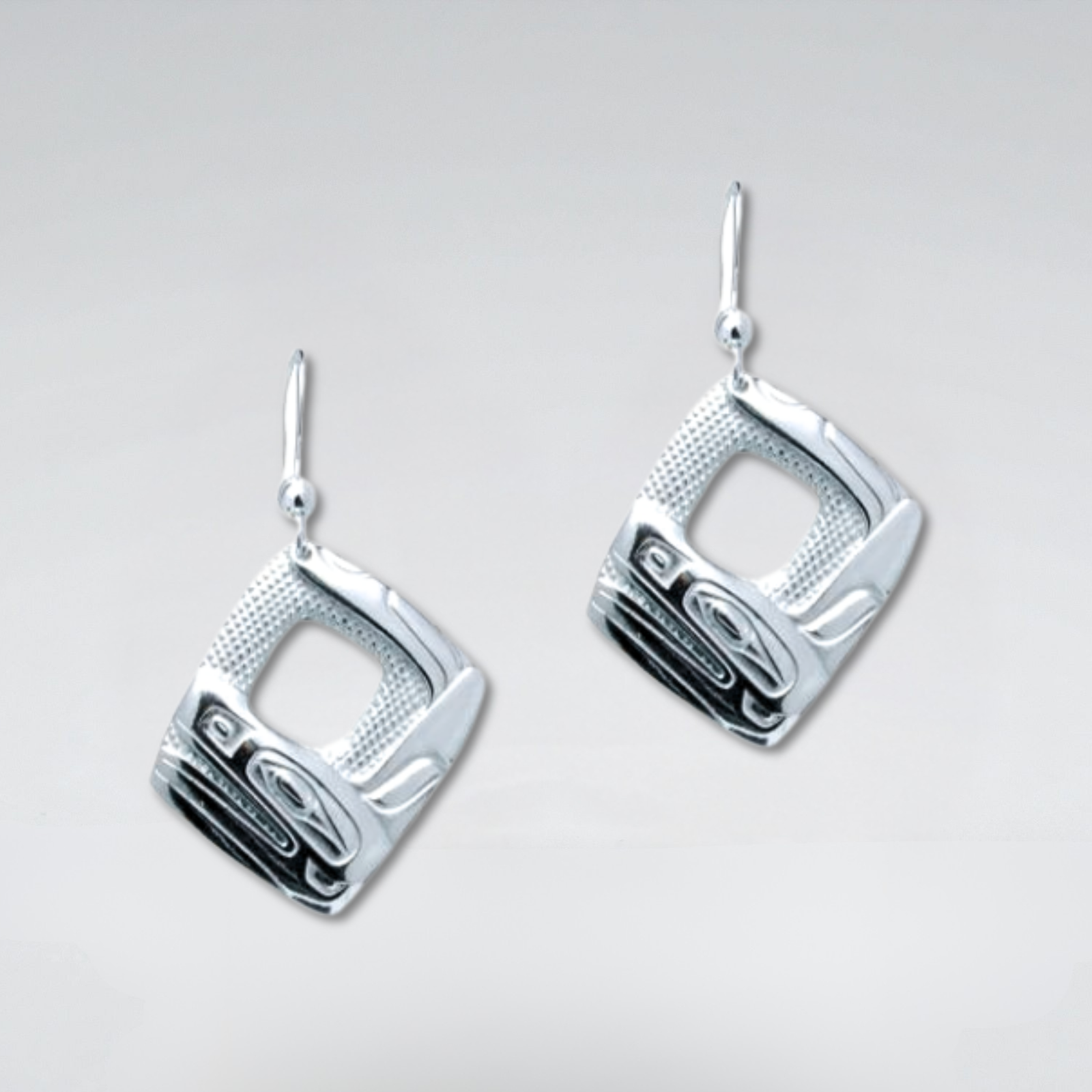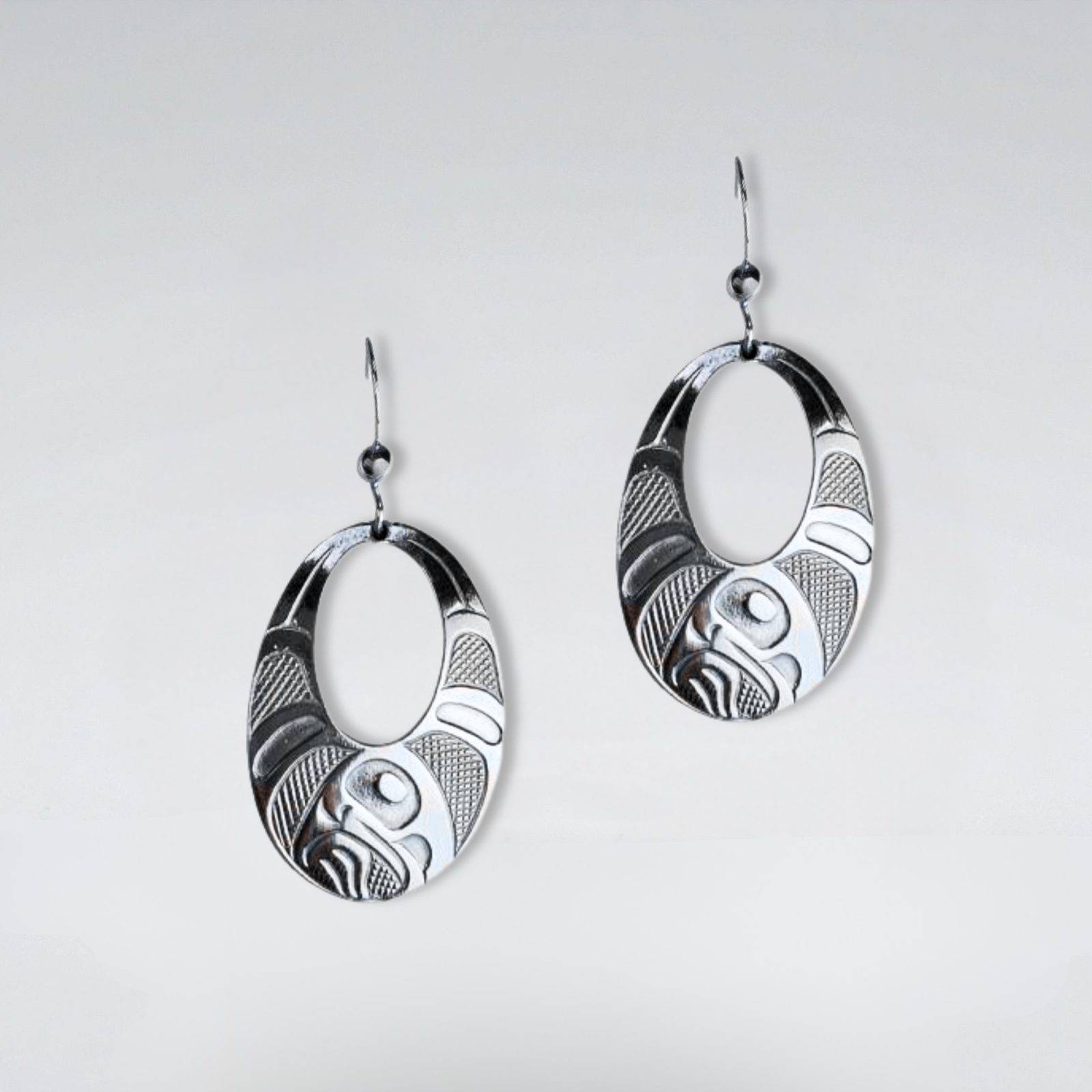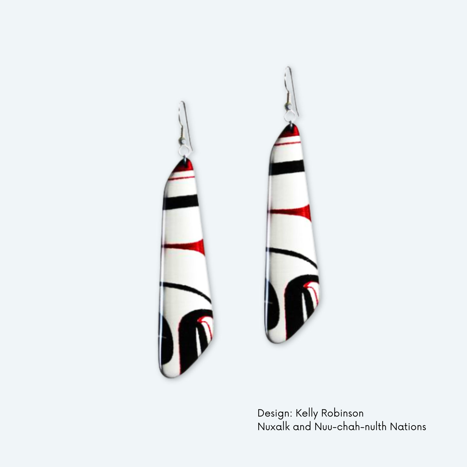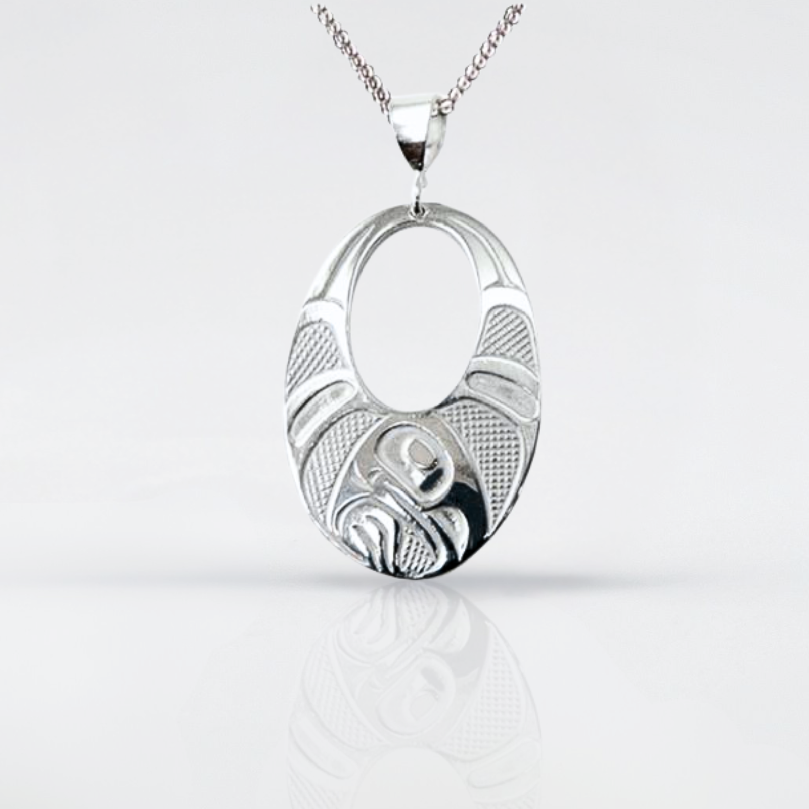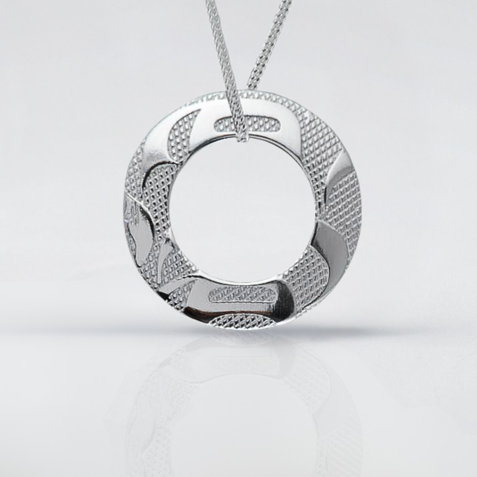 These pieces combine traditional Northwest Coast design with contemporary materials such as silver pewter alloy, sterling silver, and satin silk layered in resin.