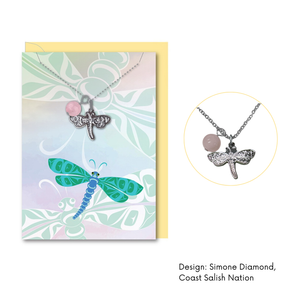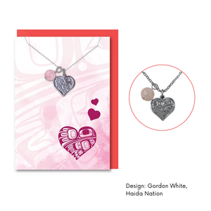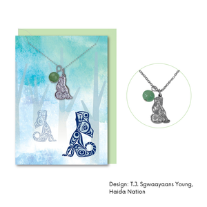 The pewter charm cards are made by Native NorthWest, a company that operates on the unceded territory of the Musqueam, Coast Salish Nation in British Columbia.