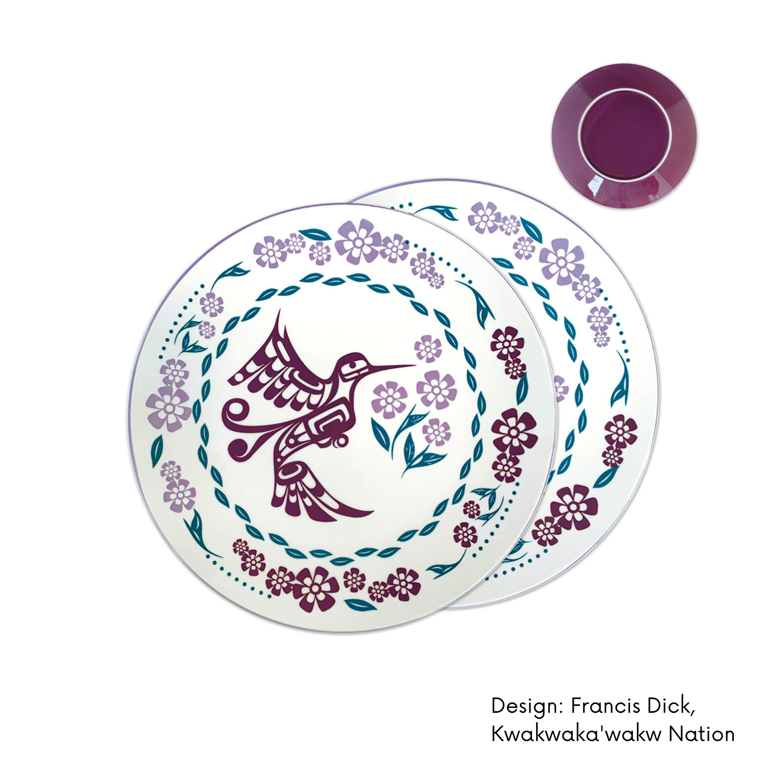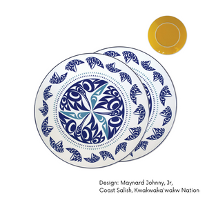 The art dinner plates are made by Native NorthWest, a company that operates on the unceded territory of the Musqueam, Coast Salish Nation in British Columbia.